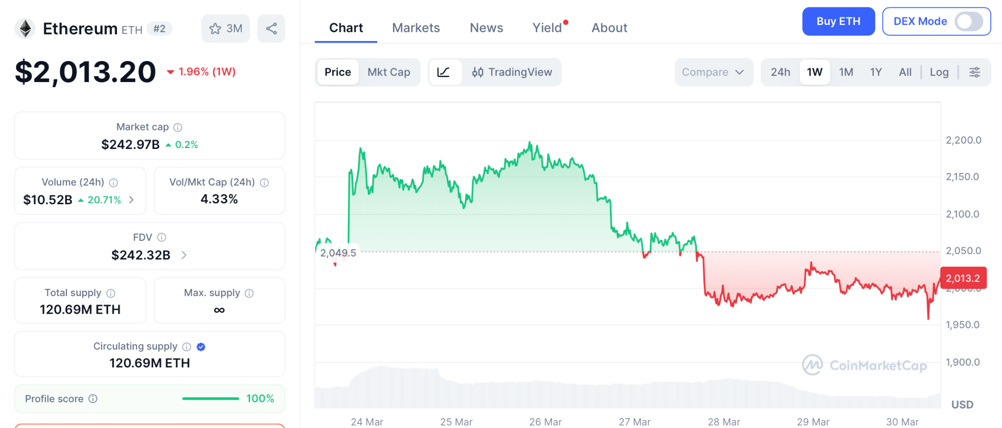 ETH traded near $2,013 on March 30 after breaking below the $2,000 level and triggering $111 million in long selling according to CoinMarketCap.