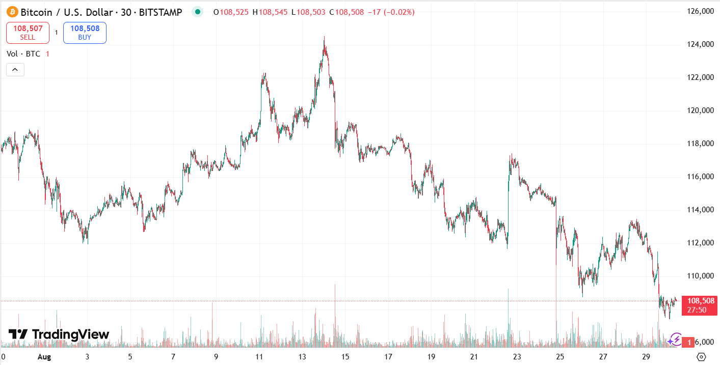 Bitcoin price has been gradually bleeding since hitting its all-time high of $124,000. On the daily chart, BTC has been unable to reclaim momentum, closing August in bearish territory.
