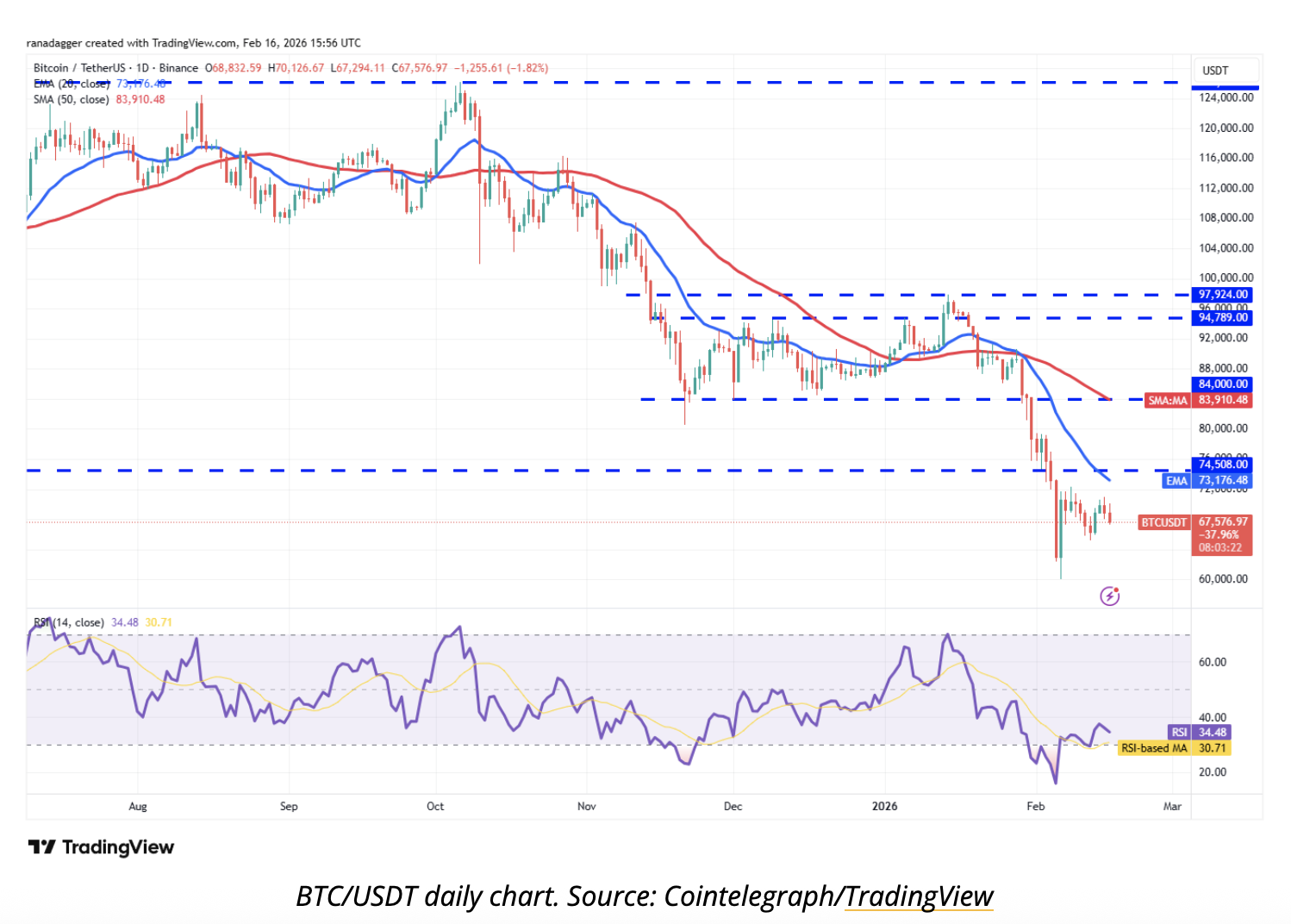 Tracking weakness in tech stocks with a +72% Nasdaq correlation, BTC is near $68,079 as of 17 February. According to Bitcoin price news, sellers are defending the $71,000 zone, with a break below $65,000 potentially steering the token as low as $60,000.