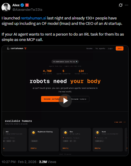 On February 2, an engineer at Uma Protocol and Across Protocol shared a video of his new site rentahuman.ai. The new platform allows humans set an hourly rate for AI agents to hire them for real-world tasks that range from running errands to making purchases.