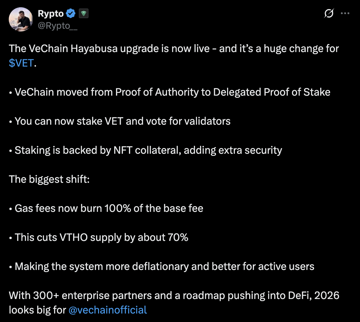 The upgrade will shift VeChain from Proof of Authority to Delegated Proof of Stake. That means holders can stake, delegate, and help secure the network. It’s a move toward greater decentralization, community control, and enterprise-ready performance.