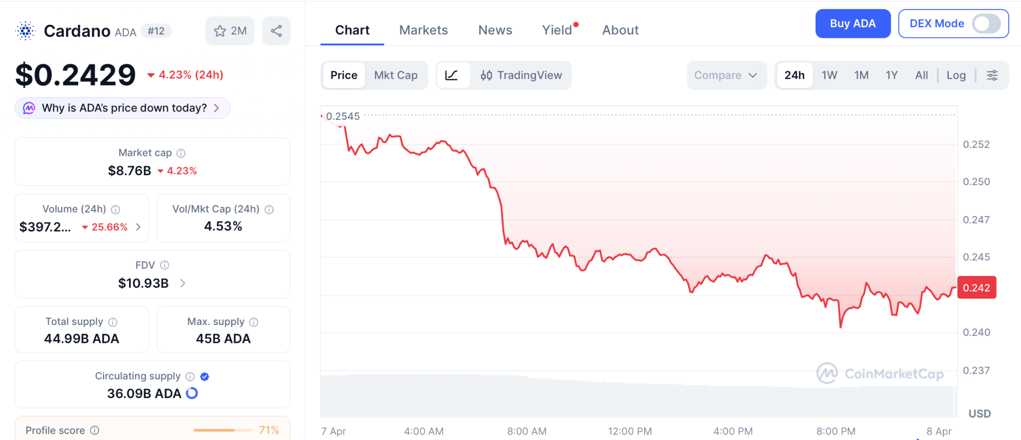 Cardano trades near $0.242 after holding $0.23 support according to CoinMarketCap, and the April roadmap brings the Protocol 11 hard fork plus the Midnight privacy sidechain that went live with Monument Bank already running tokenized deposits. Whales bought 220 million ADA worth $53 million in one week, adding the depth the ecosystem needed.