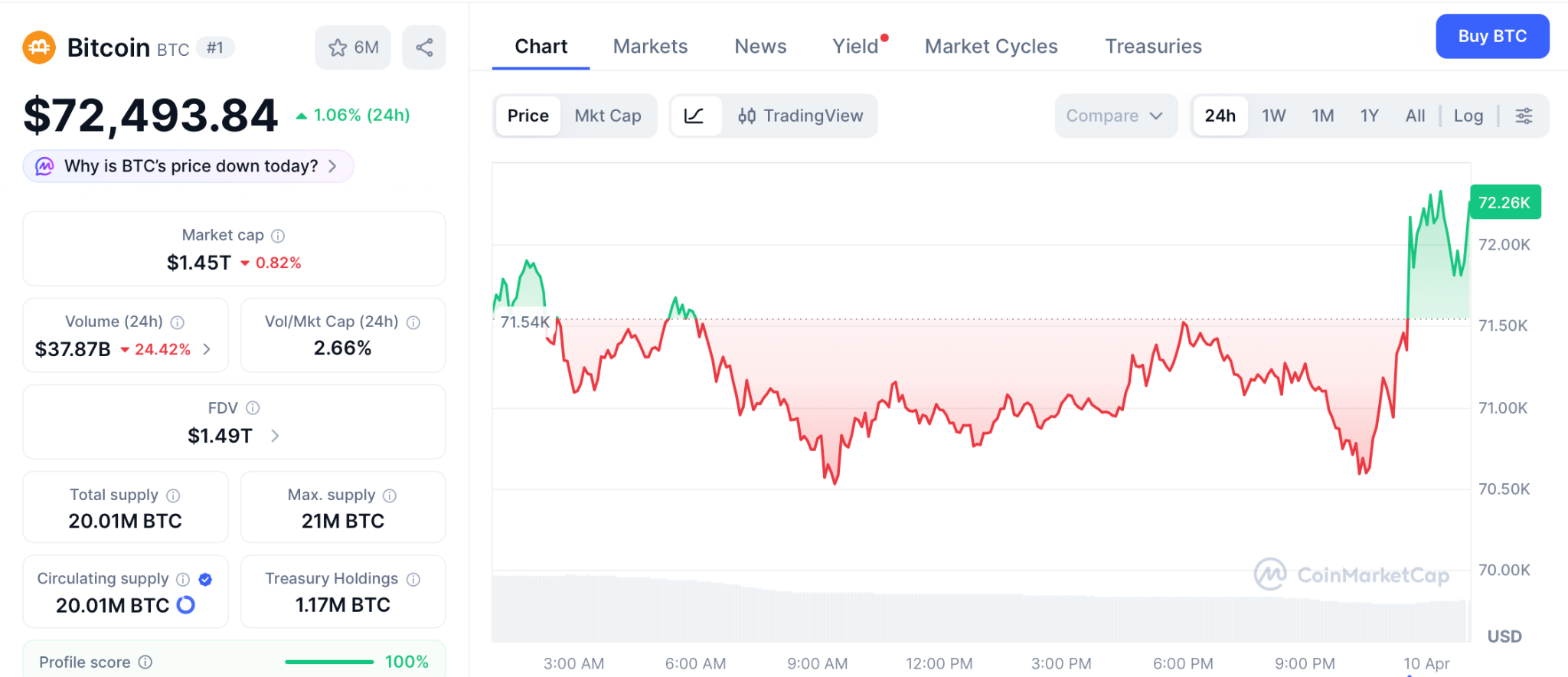 BTC price sits near $72,493 as of April 9, up from $67,000 before the ceasefire, per CoinMarketCap. Strategy kept stacking and holds 766,970 BTC while exchange reserves sit near multi year lows.