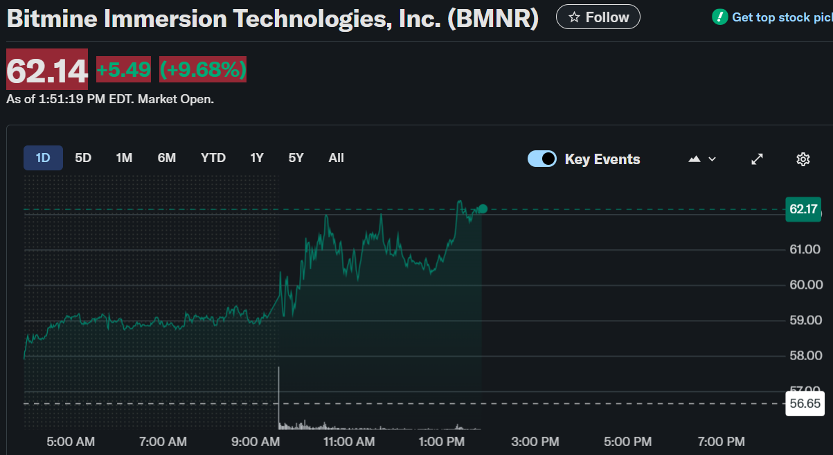 BitMine Immersion Technologies surged 9.68% during Monday’s trading session, reaching $62.14 by 1:51 PM EDT.