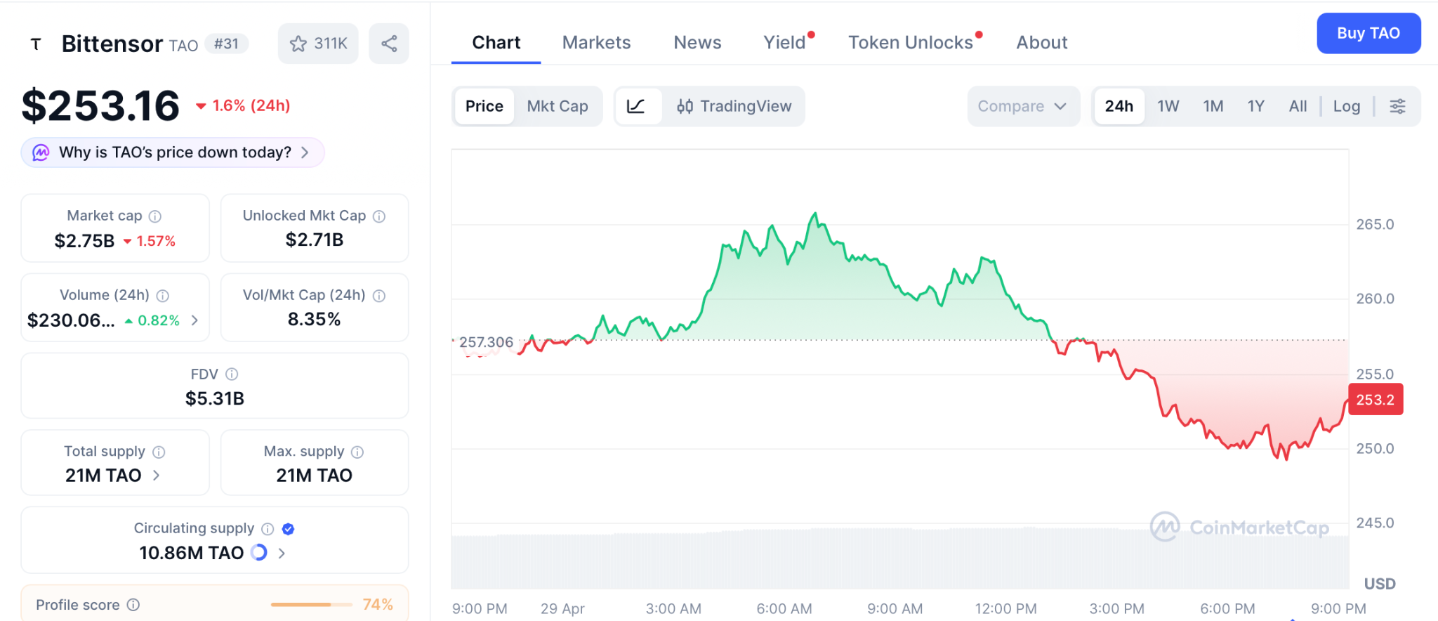Bittensor (TAO) trades at $253 per CoinMarketCap, recovering after the Covenant AI sell-off pushed it down 23% in one week. With 67% of supply locked in staking, only about 3 million TAO trade freely.