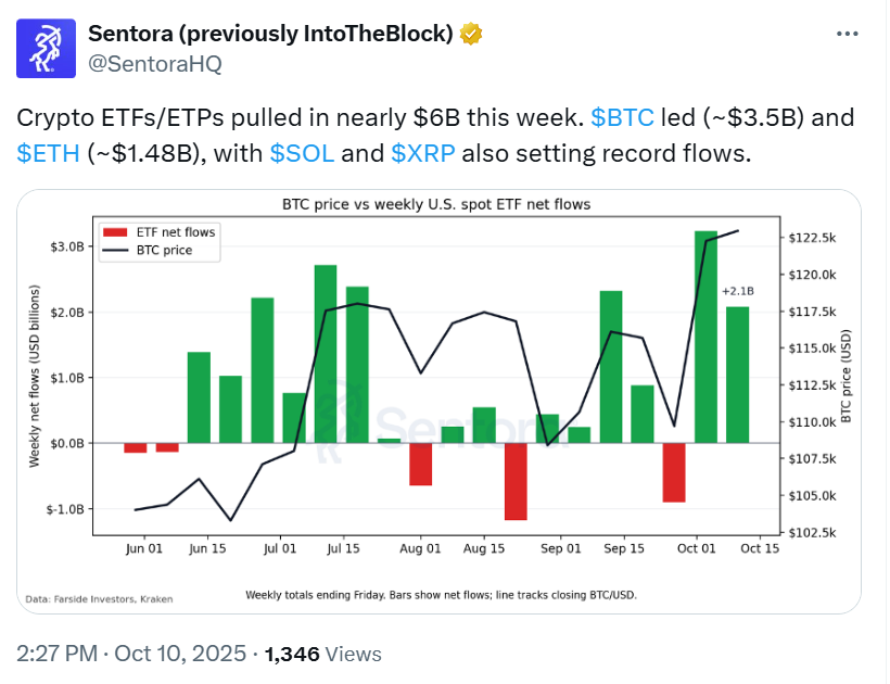 Institutional investors are showing no signs of retreat. In the past week alone, Bitcoin, Ethereum, XRP, and Solana investment products attracted roughly $6 billion, according to analytics firm Sentora, formerly IntoTheBlock.