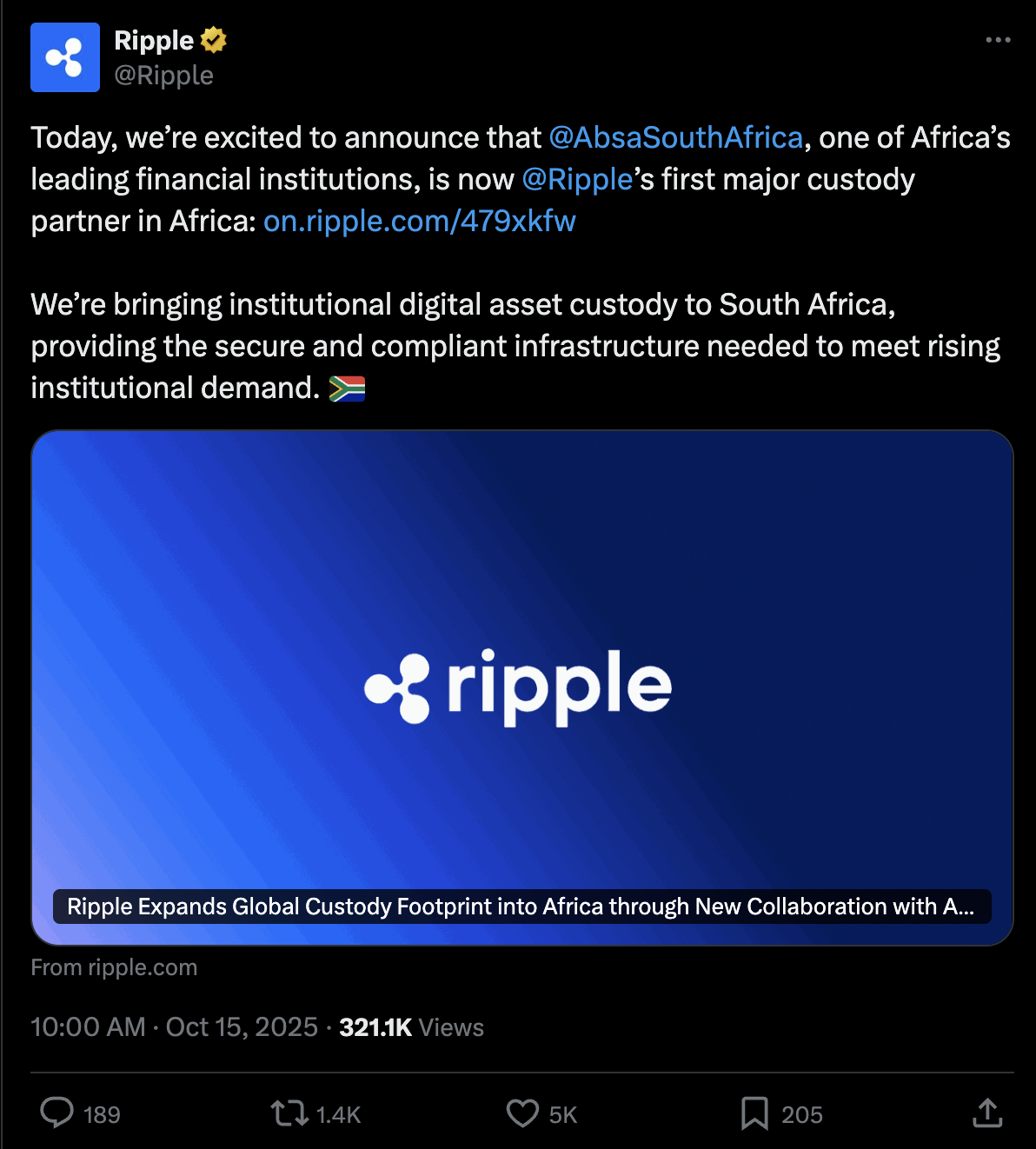 Ripple announced a strategic partnership with Absa Bank, one of South Africa’s largest financial institutions, to roll out bank-grade crypto custody services. This marks Ripple’s first major custody partnership on the continent, expanding its growing digital asset infrastructure into a rapidly evolving market.