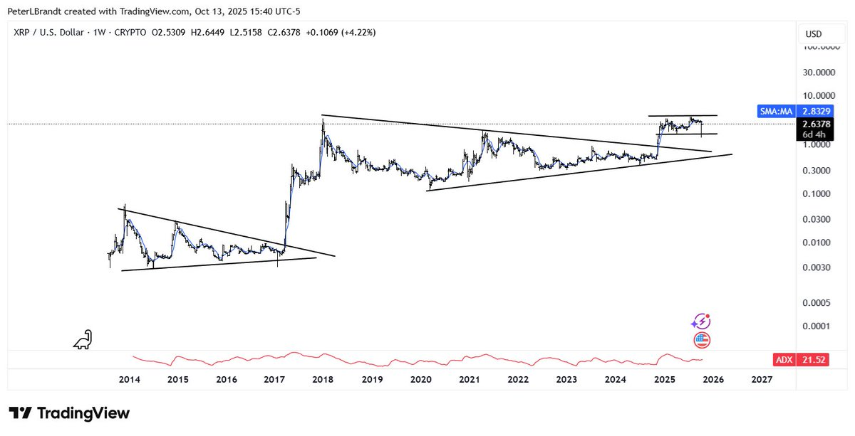 The move came as XRP reclaimed the $2.50 level, with legendary trader Peter Brandt confirming the breakout from a descending channel that has held since 2014.
