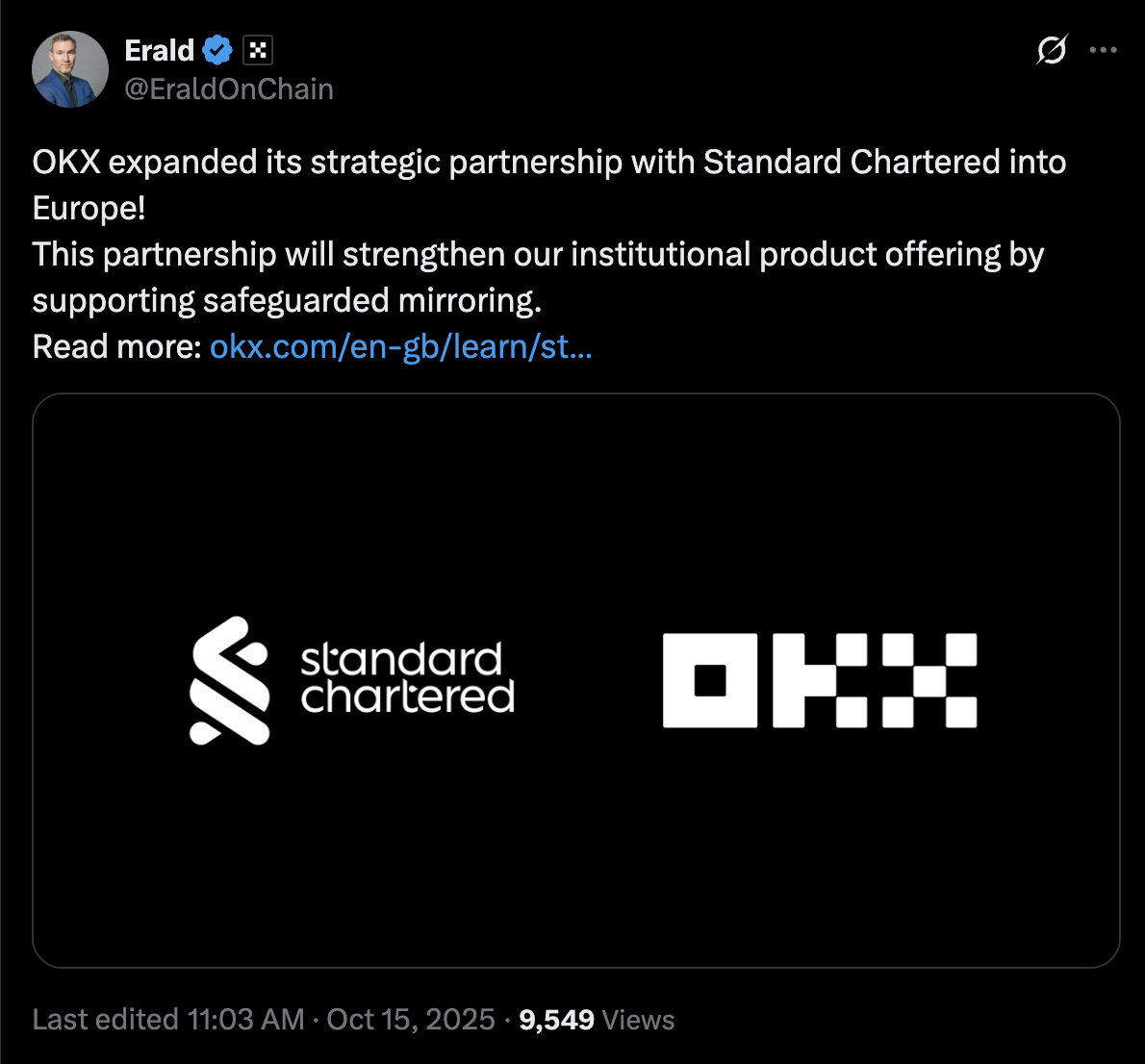 Standard Chartered has officially partnered with OKX to custody crypto assets for institutional clients across Europe.