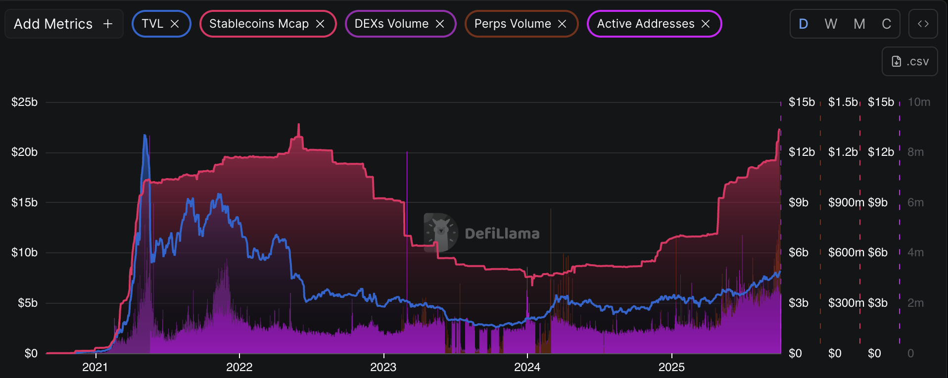 One of the reasons behind the strength of both BNB and Mantle is the rising on-chain activity. For BNB, the asset is seeing an increase in almost every key on-chain metric, including TVL, active users, DEX volume, perp volume, and stablecoin market cap.