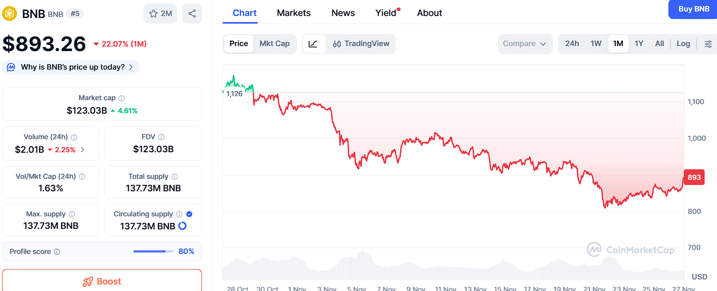 BNB, currently near $893, is showing one of the most dependable bullish structures among large-cap tokens. Its uptrend stays firm above help at $867, $832, and $792, zones where long-term consumers usually acquire. These stages provide the stableness BNB needs to preserve momentum, even throughout market pullbacks.