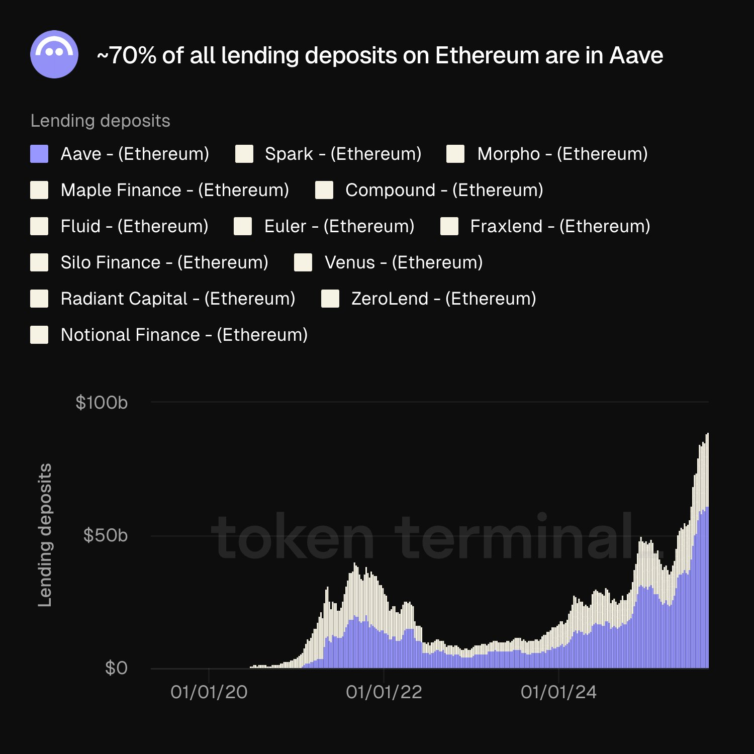 For DeFi followers, Aave has stayed the most reliable name in Ethereum-based borrowing and lending. As of September 2025, it maintains a commanding 70% share of that market, showing how deeply it anchors the DeFi ecosystem.