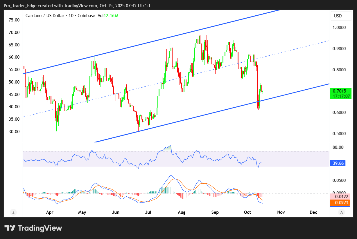 Cardano price held near important support zones in October 2025 as traders watched whether the token would confirm a recovery or face additional pressure. The asset traded around $0.70 to $0.80 during this period.