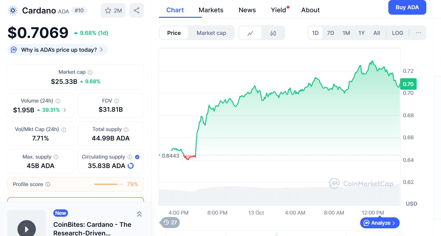 At the time of writing, Cardano (ADA) was trading at $0.7069, marking a 9.68% daily gain. The token’s market cap stood at $25.33 billion, supported by a 39% surge in 24-hour trading volume to $1.95 billion, reflecting renewed investor confidence.