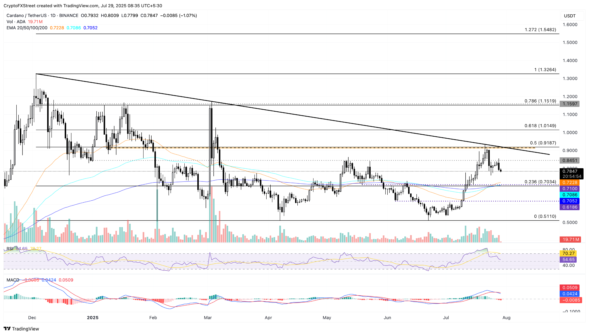 Still, short-term sentiment tells a different story. Derivative metrics show Cardano Price Today is being weighed down by increasing short positions and falling Open Interest, which dropped $230 million in just one week. ADA’s failed breakout attempt near $0.9187 and its rejection from the multi-month resistance trendline point to a possible drop to its 50-day EMA around $0.72.