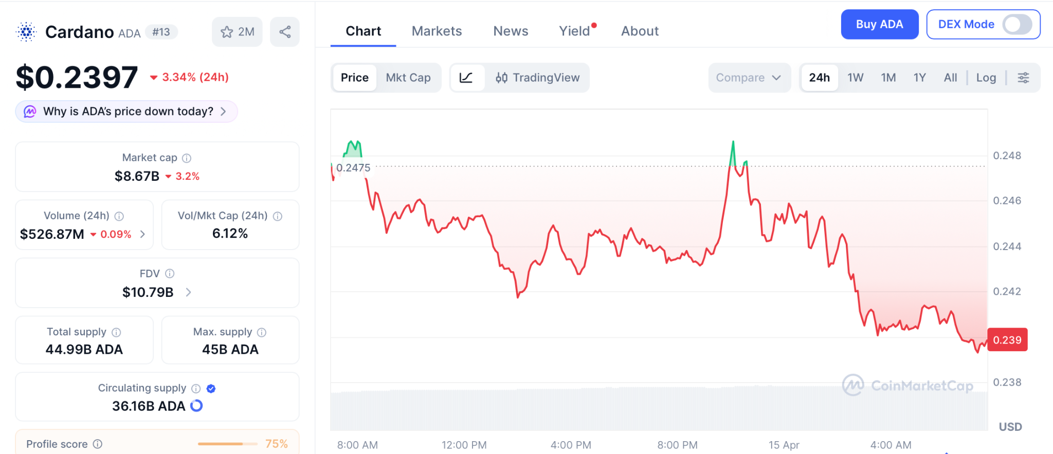 Cardano (ADA) trades at $0.2397 according to CoinMarketCap, with Protocol 11 approaching and the Hashdex Nasdaq ETF giving institutions their first regulated route into ADA. CoinCodex projects $0.38 by mid-2026 while Changelly sees $0.23 to $0.31 for April.