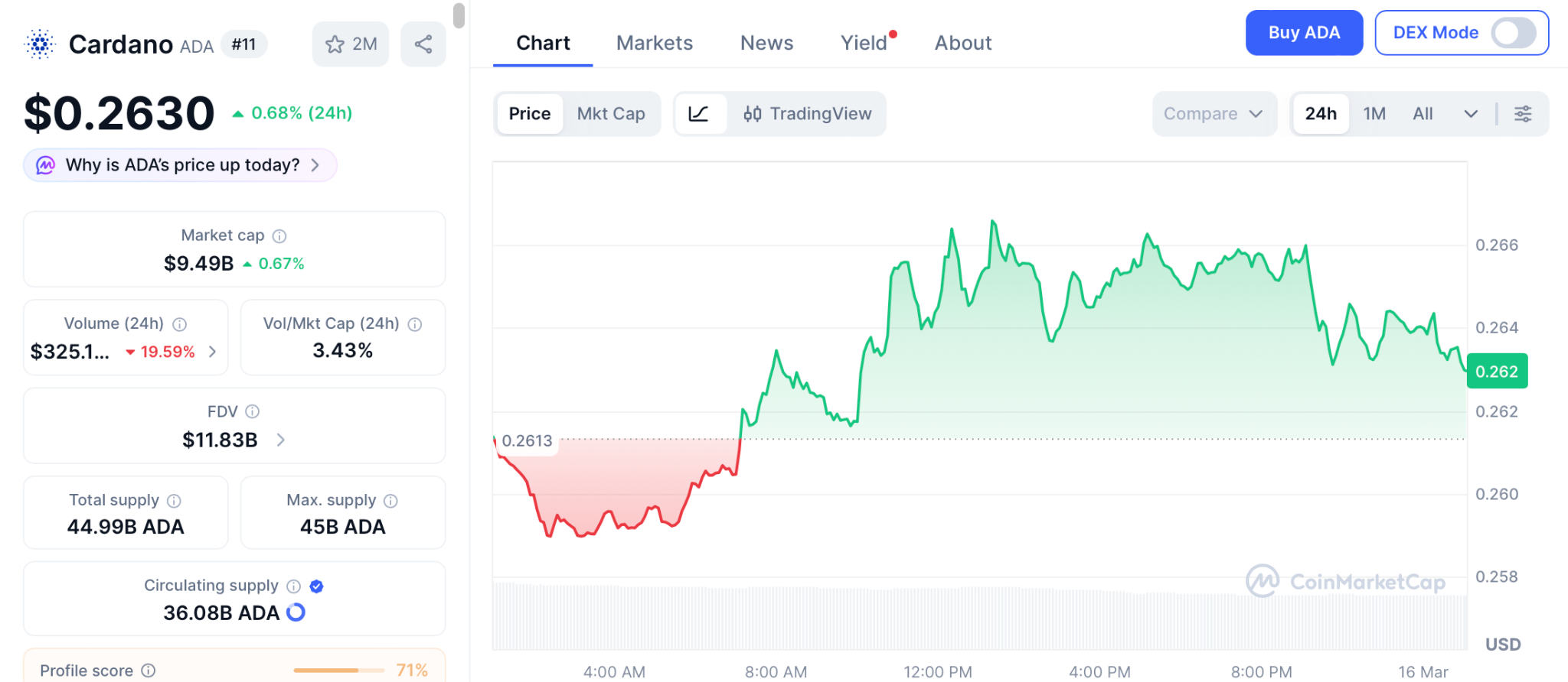 ADA trades at $0.26 as of March 15 according to CoinMarketCap, up modestly from recent lows as traders rotate back into altcoins. The DeFi ecosystem fell short of its $1 billion TVL milestone, confirming development has not translated into the inflows the community expected.