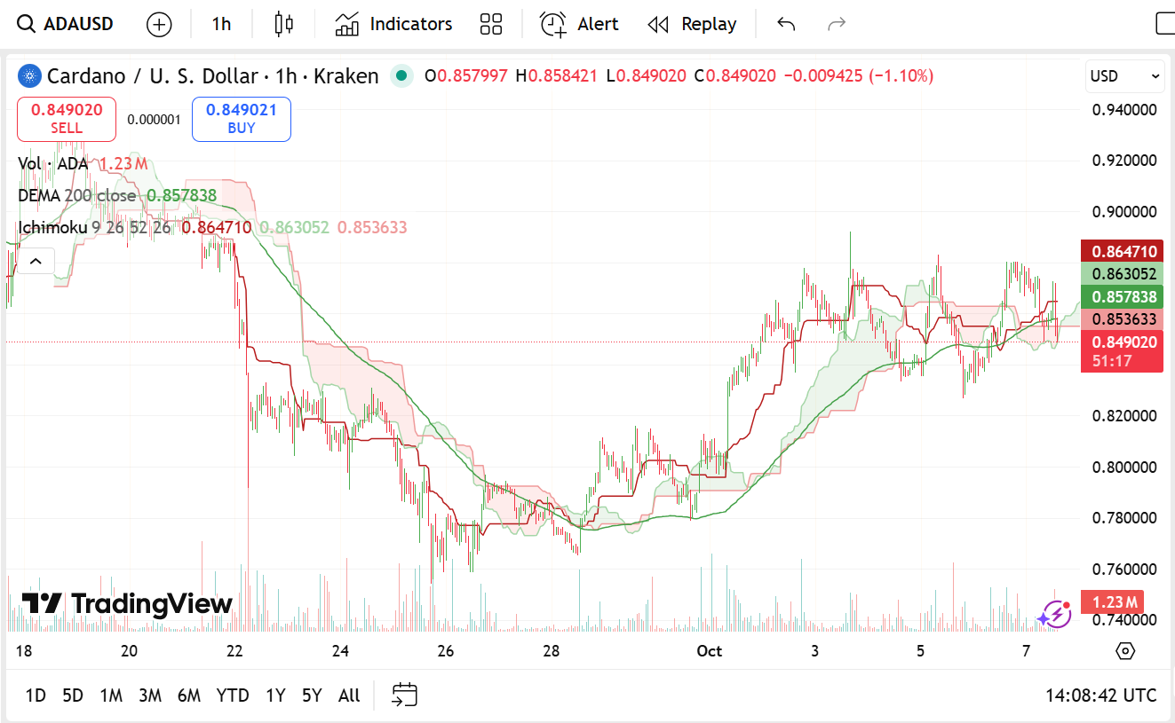 At the time of writing, Cardano (ADA) trades at $0.8490, recording a 0.72% increase in the past 24 hours. Its market capitalization is $30.7 billion, while daily trading volume has risen by 30.62% to $1.49 billion.