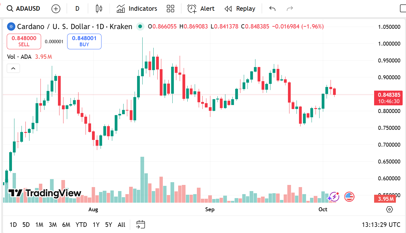 Cardano is currently selling at $0.8480, having lost by a significant 1.26% in the day. Its market capitalization is $30.35 billion, underpinned by a trading value of $1.4 billion, rising by 3.09%. These figures highlight that activity is consistent, although overall sentiment remains cautious.