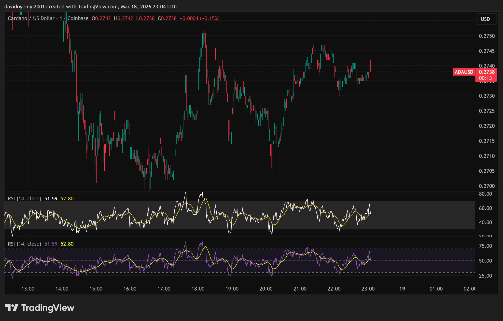 Cardano is trading at $0.2771, down 2.67% over the last 24 hours. ADA price today is holding above the $0.26 to $0.27 support band, but the broader momentum remains negative. The immediate focus is $0.28.