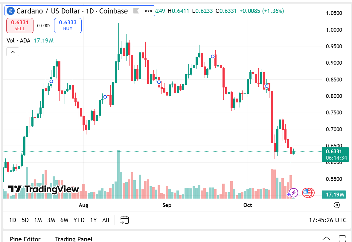 Cardano is currently trading at $0.6331, marking a 3.86% decline in the last 24 hours. Its market capitalization stands at $22.71 billion, with $658.87 million in daily trading volume, up by 64.09%. Despite short-term price gains, analysts tracking Cardano Price Prediction say the network still faces challenges related to on-chain adoption and developer activity.