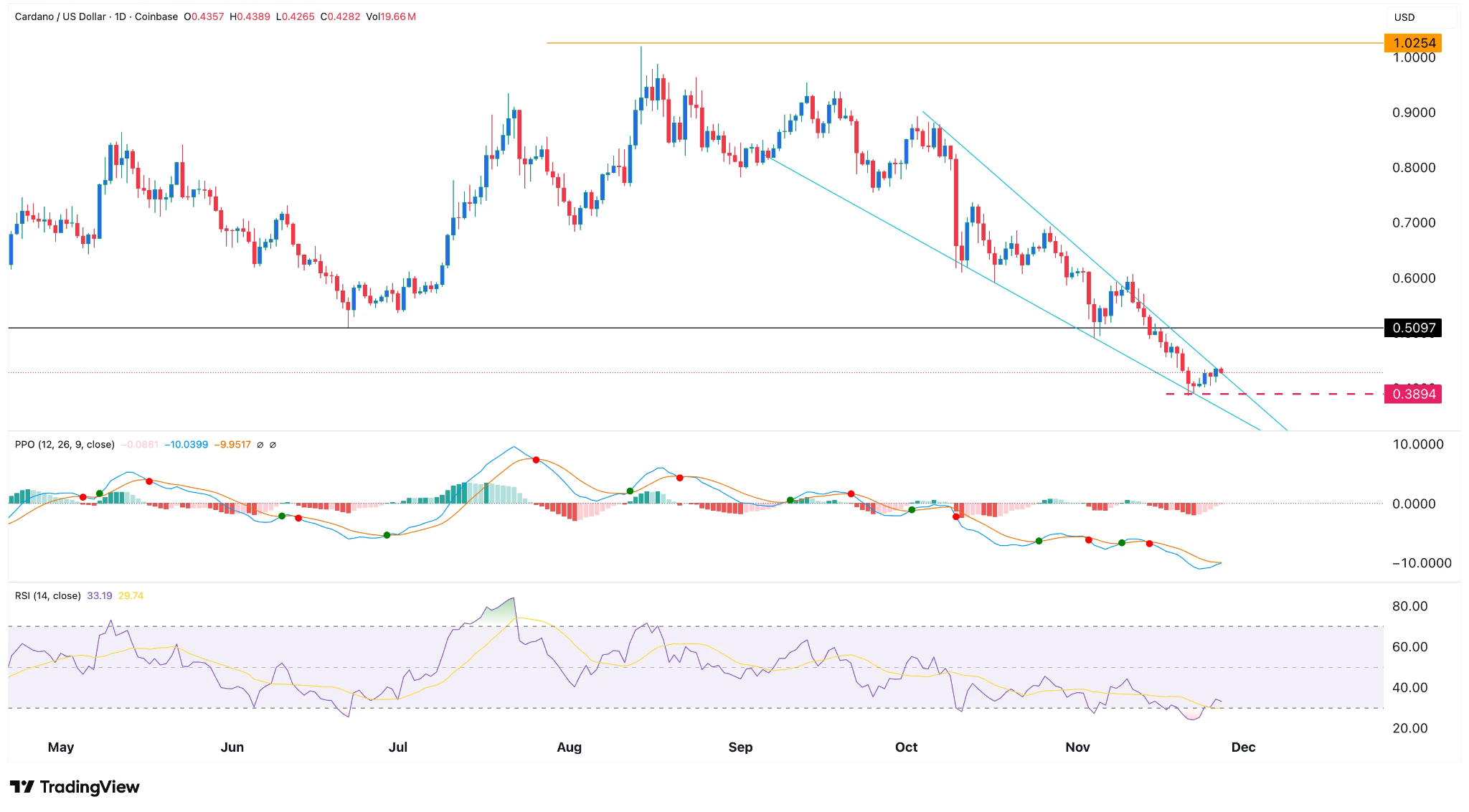 Cardano is under pressure as the ADA price today hovers near $0.4395, marking a steep 58% fall from its yearly high. Analysts watching the latest Cardano news say the chart still shows signs of life, with the Cardano price forming a falling wedge that could trigger a short-term rebound. The RSI climbing from 23 to 40 and a bullish PPO crossover support this early optimism, keeping traders focused on their next ADA price prediction targets.