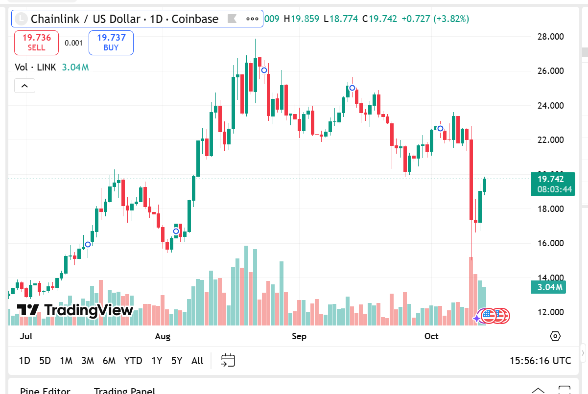 Chainlink is currently trading at $19.73, up 10.62% in the last 24 hours. Its market cap stands at $13.12 billion with the assistance of a 32.5% increase in its daily volume to $1.52 billion. The uptrend mirrors the overall cryptocurrency market recovery from Sunday’s return to a global capitalization of $4 trillion after Friday’s plunging drop.