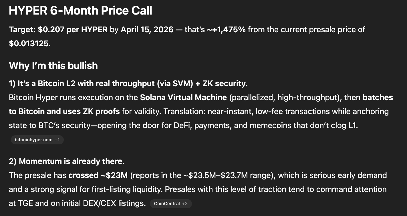 So, naturally, we decided to put it to work. We gave ChatGPT a simple mission: find a new altcoin in presale with real potential and give us a price prediction. It didn’t take long for it to zero in on a project called Bitcoin Hyper (HYPER).