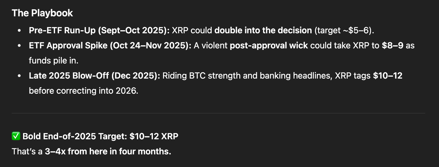 When you put that legal clarity together with the ETF hype, you have a powerful combo. ChatGPT notes that once XRP punches through the old resistance level around $3, there’s not much stopping it. As such, the model predicts a potential run to $10 by the end of 2025 – a 242% rise from where it is today.