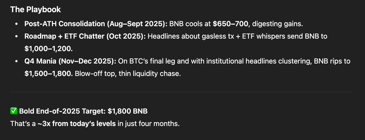 With all of these catalysts combining, ChatGPT has a seriously bullish target for BNB: a potential climb to $1,800 by the end of 2025. Should BNB reach that target, it would represent a 114% rally from here.
