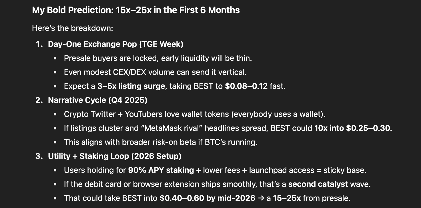 What really makes Best Wallet stand out is its solid foundation; it doesn’t require KYC and boasts tokenomics designed to promote long-term sustainability. That’s why ChatGPT is predicting a potential 10x rally from BEST’s presale price of $0.0255, putting it in the $0.25 to $0.30 range by the end of 2025.