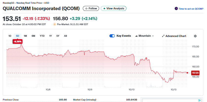 At Monday’s premarket session, Qualcomm (QCOM) traded at $157.12, up +2.35%, after closing at $153.51, down -7.33% on October 10. The drop came as Chinese regulators announced a new antitrust investigation into the company, one that could carry legal and financial penalties under Beijing’s updated competition laws.
