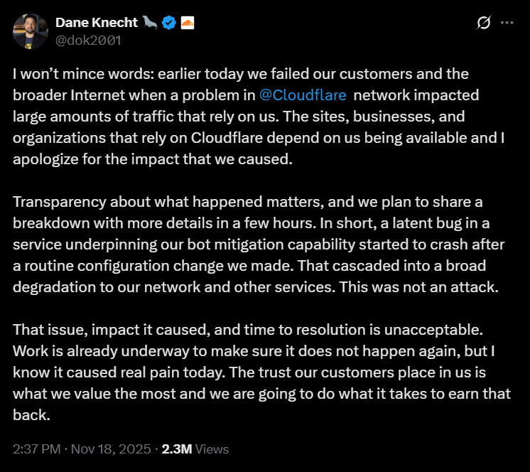 - Cloudflare experienced a major outage on Tuesday that took down approximately 20% of internet webpages, including crypto platforms like Coinbase, BitMEX, Toncoin, and Blockchain.com