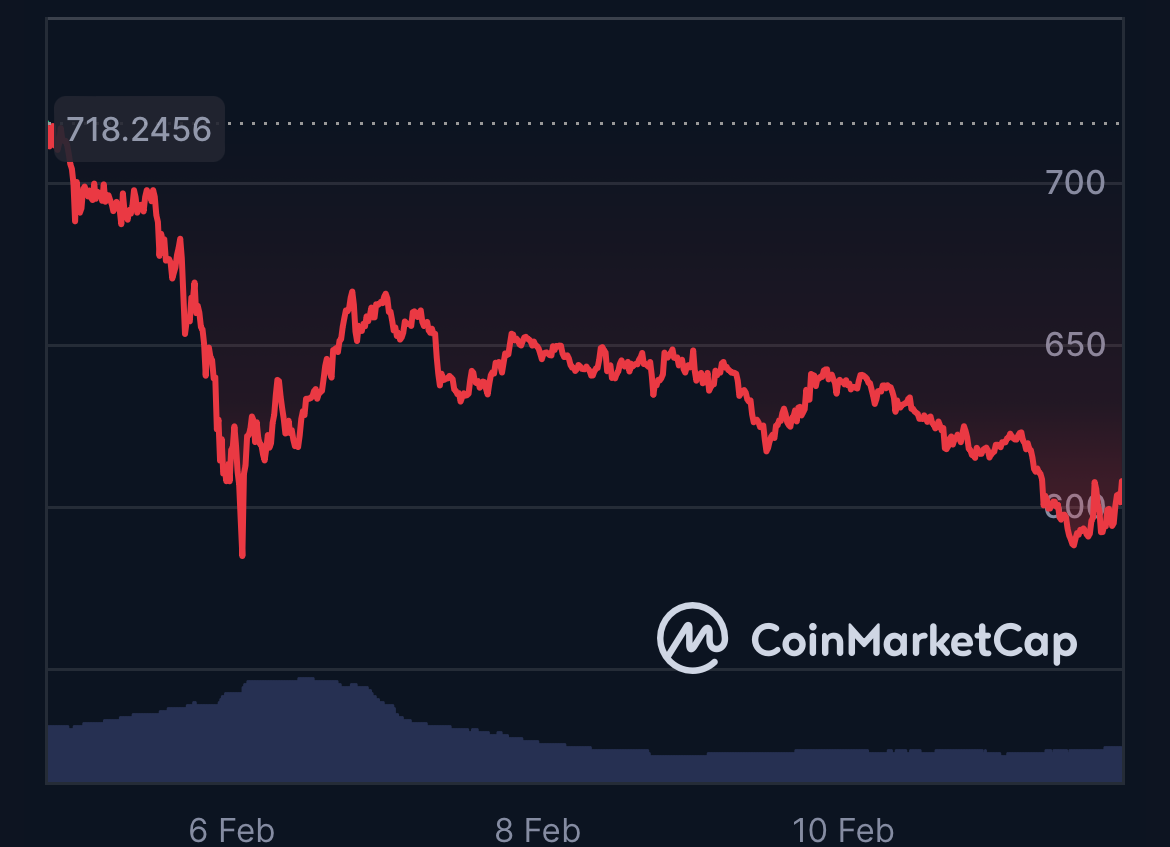 BNB has slipped sharply below a key technical and psychological level, trading at $607.63 on February 11, down from $718.24 on February 5, a drop that shows the recent crypto-crashing sentiment rippling across markets.