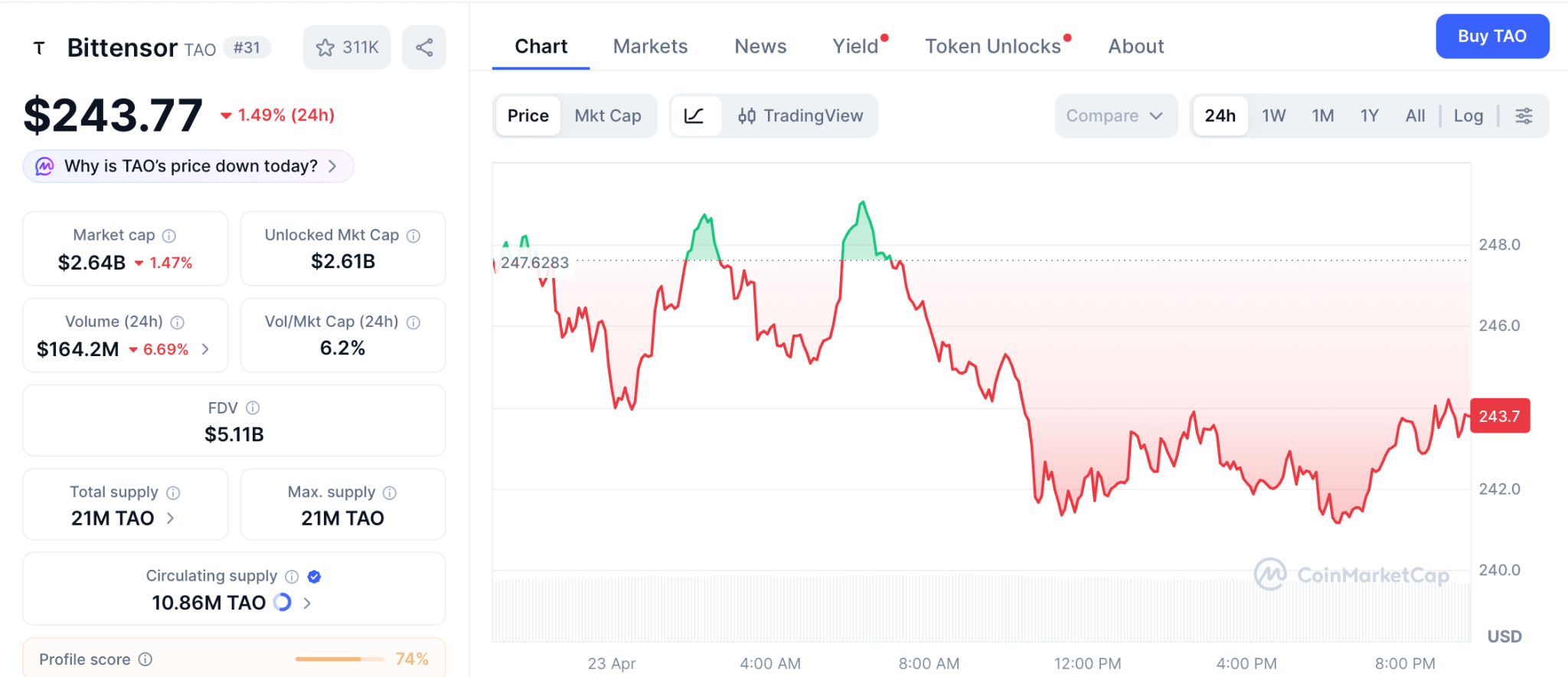 Bittensor (TAO) trades at $243 per CoinMarketCap, down 1.49% over 24 hours as the token digests the Covenant AI subnet exit from early April. The all-time high of $1,370 sits over 450% above current price.