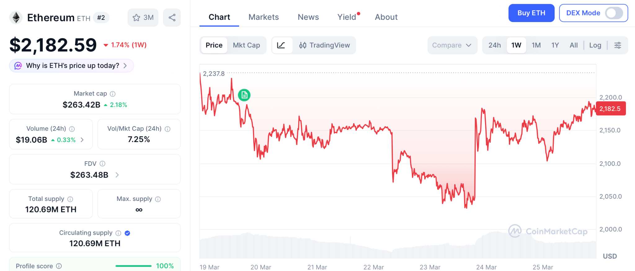 Ethereum trades near $2,182 as of March 24 after dipping 5% on the week and tracking a broader selloff from war tensions, with options skew climbing to 7% as professional desks hedge the downside, according to CoinMarketCap.