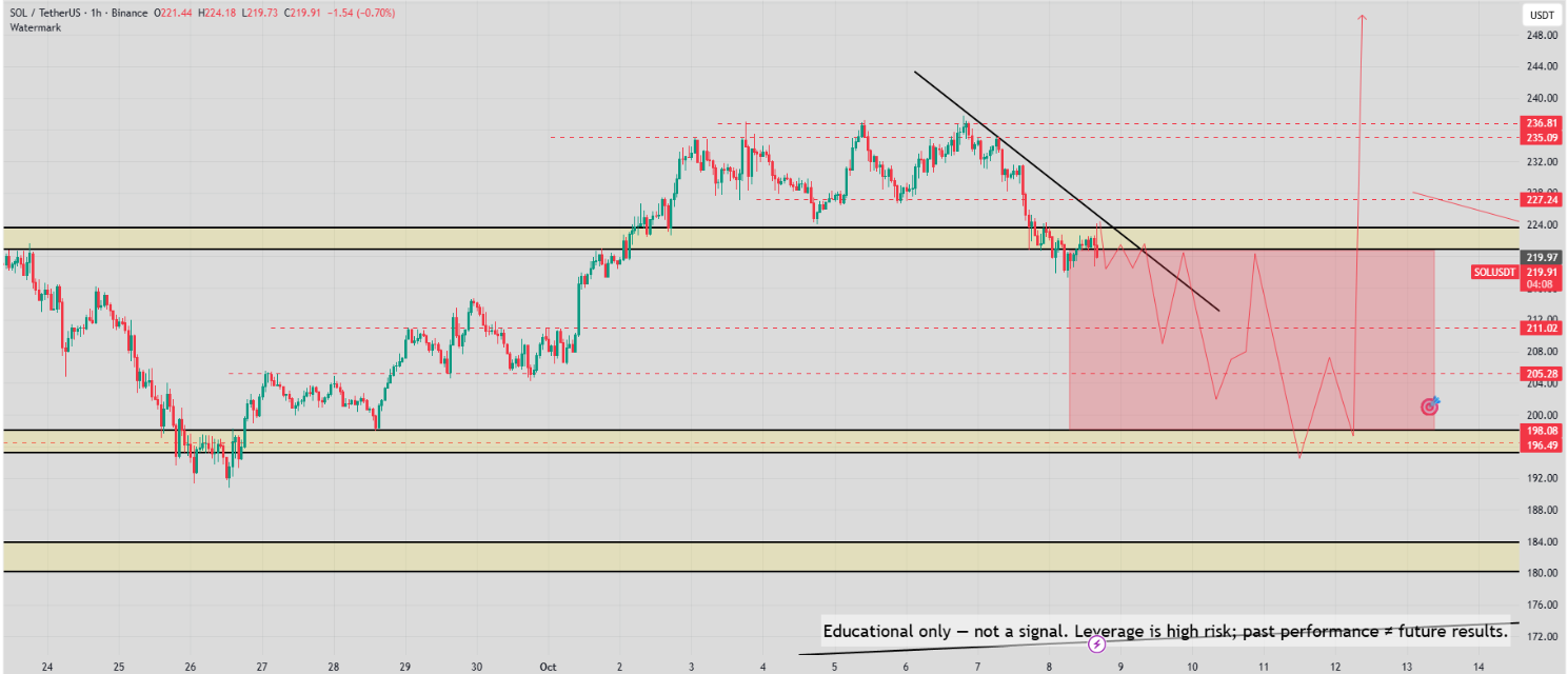 Right now, the Solana price sits inside a tight range, and buyers are defending dips near $218 to $214. As long as that shelf holds, the ABC up-leg can ignite toward $235 to $242, where prior supply sits. A strong break over $242 would signal a trend continuation and keep the Solana price in a stair-step advance.