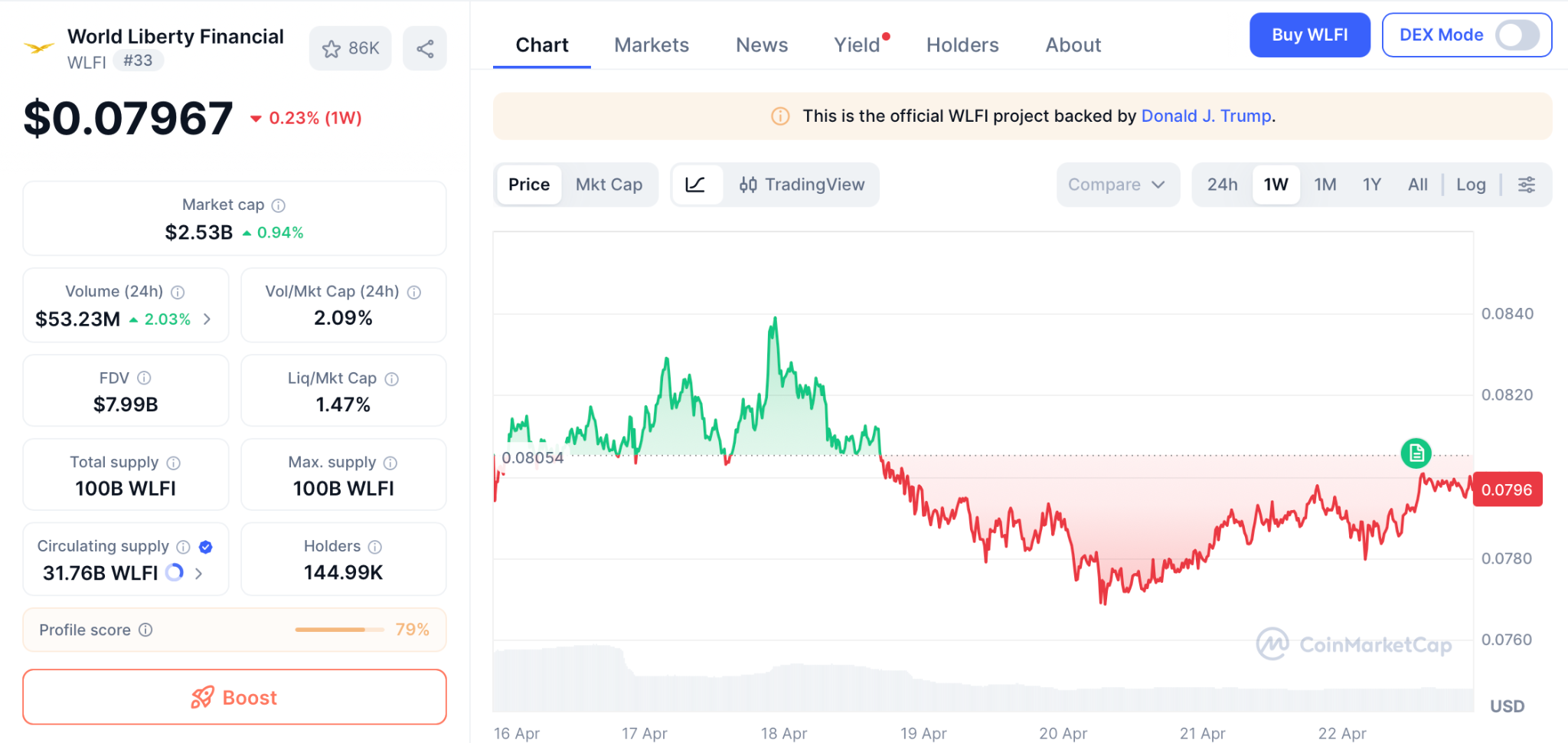 World Liberty Financial (WLFI) trades near $0.079 on April 22 per CoinMarketCap with its RSI at 17.50 flagging one of the deepest oversold signals in its history, while the April 15 governance proposal placed a 4.5 billion token burn on the table across 62.28 billion locked WLFI tokens.
