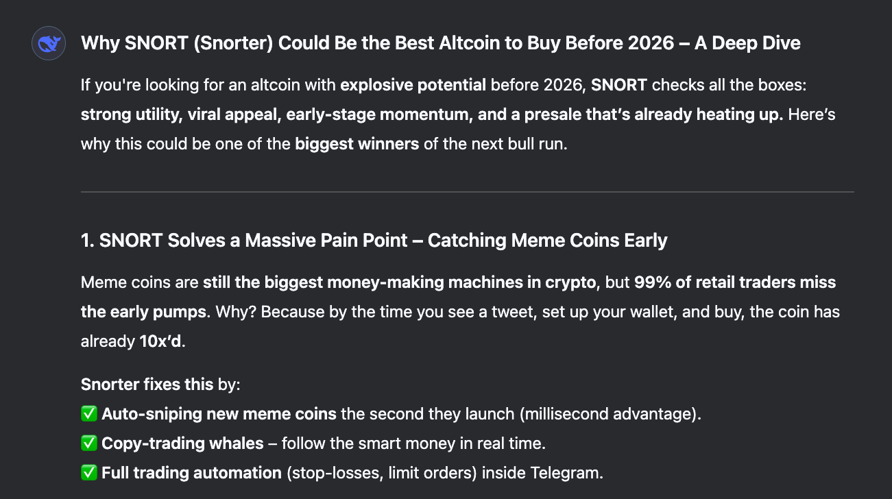 Snorter (SNORT) is building the tools traders need to catch those lightning-fast meme coin pumps. Basically, it’s an automated trading bot on Solana designed specifically for degen traders. And DeepSeek believes its native SNORT token could be a great buy opportunity.