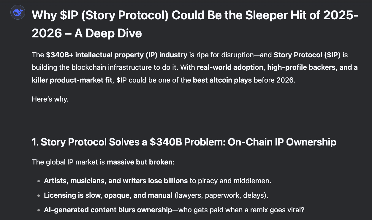 DeepSeek believes that if creative rights and digital ownership fully transition to blockchain in the next couple of years, Story will become a cornerstone crypto project. And if it does, then its native IP token could be one of the best altcoins to buy and hold.