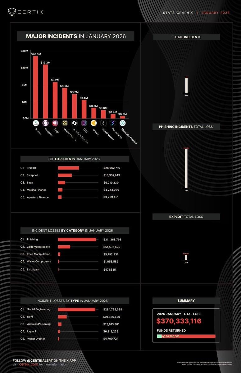 It also represents a 214% increase from December and more than a 277% jump compared to January 2025. In addition, CertiK reported that most of the losses stemmed from a single social engineering attack, where one victim lost approximately $284 million.