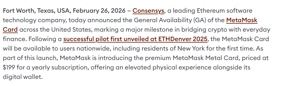 MetaMask parent company Consensys announced the official launch of its MasterCard-powered spending card in the U.S on Thursday. The launch follows initial pilots in 2024 and 2025. According to the official statement, the debit card will power crypto spending across 49 states in America.