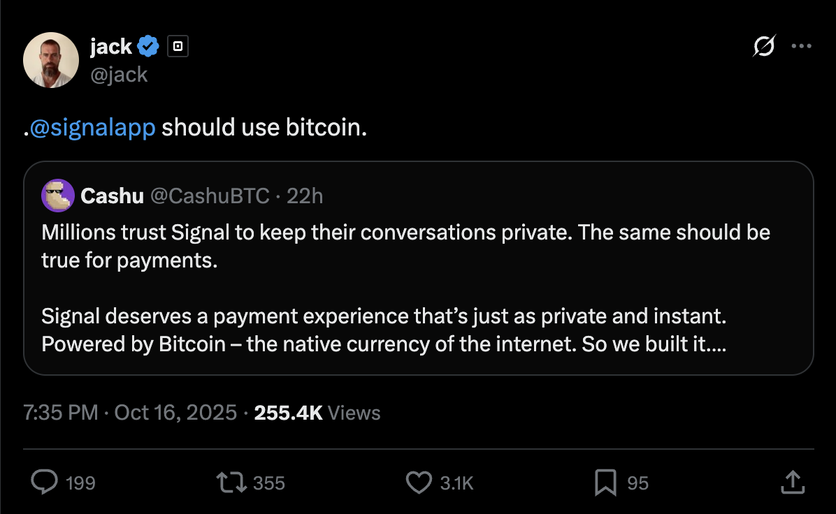 Dorsey shared the “Bitcoin for Signal” campaign on X, calling for Signal to ditch its current MobileCoin setup, which has faced criticism for centralization. Developer Peter Todd echoed the sentiment, stating Signal should “accept reality and just add Bitcoin support.”