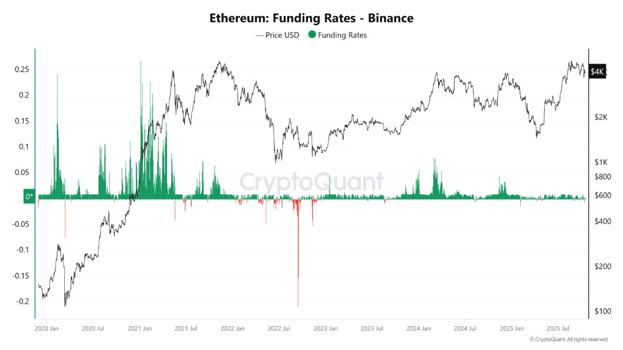 Funding rates on Ethereum remain positive, showing long positions still dominate. But they’re far from overheated. Current levels sit between 0.01% and 0.03%, much lower than the 0.1%+ spikes during the 2021 rally. That means there’s still room to grow without tipping into euphoria.