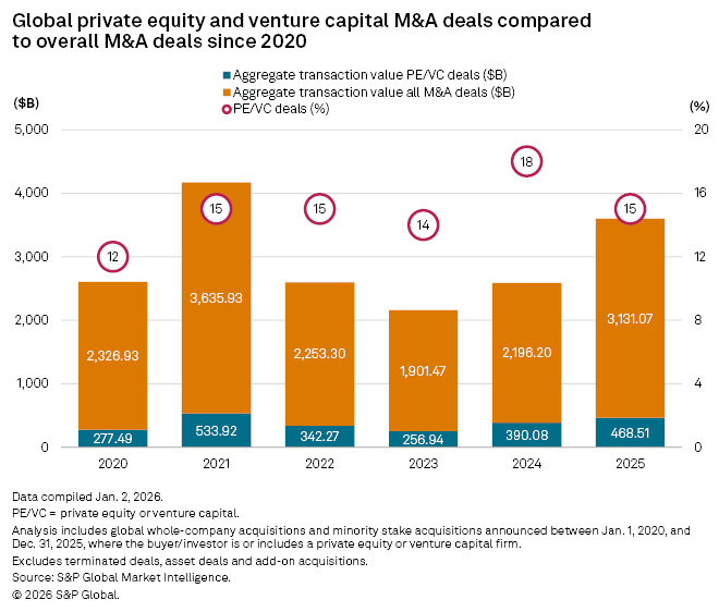 Global PE and VC M&A deals compared to overall M&A deals since 2020. (Source: S&P Global).