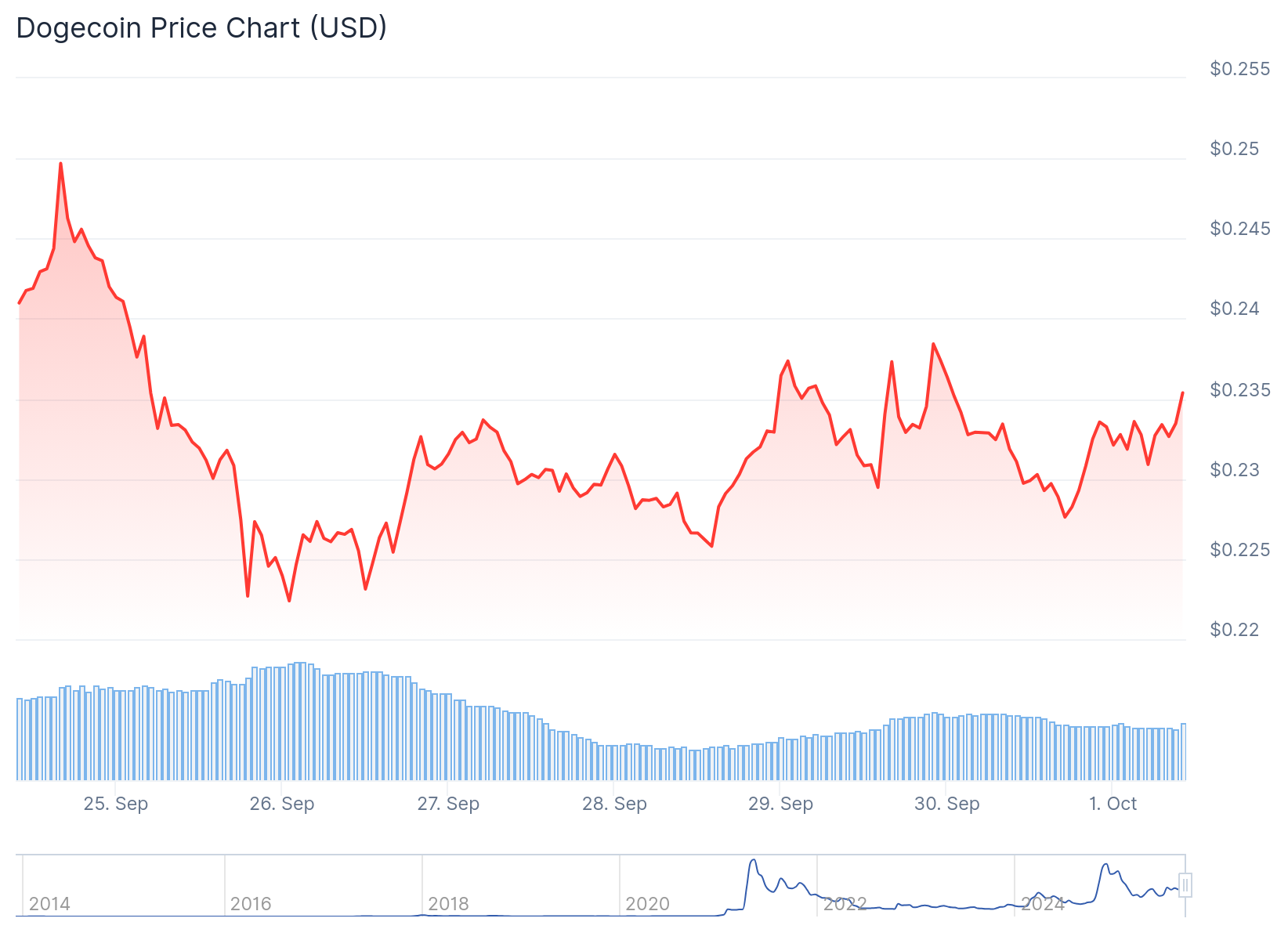 Daily trading volume exceeds 780 million DOGE tokens. The 24-hour price range between $0.2265 and $0.2389 shows the coin trading in a tight range.