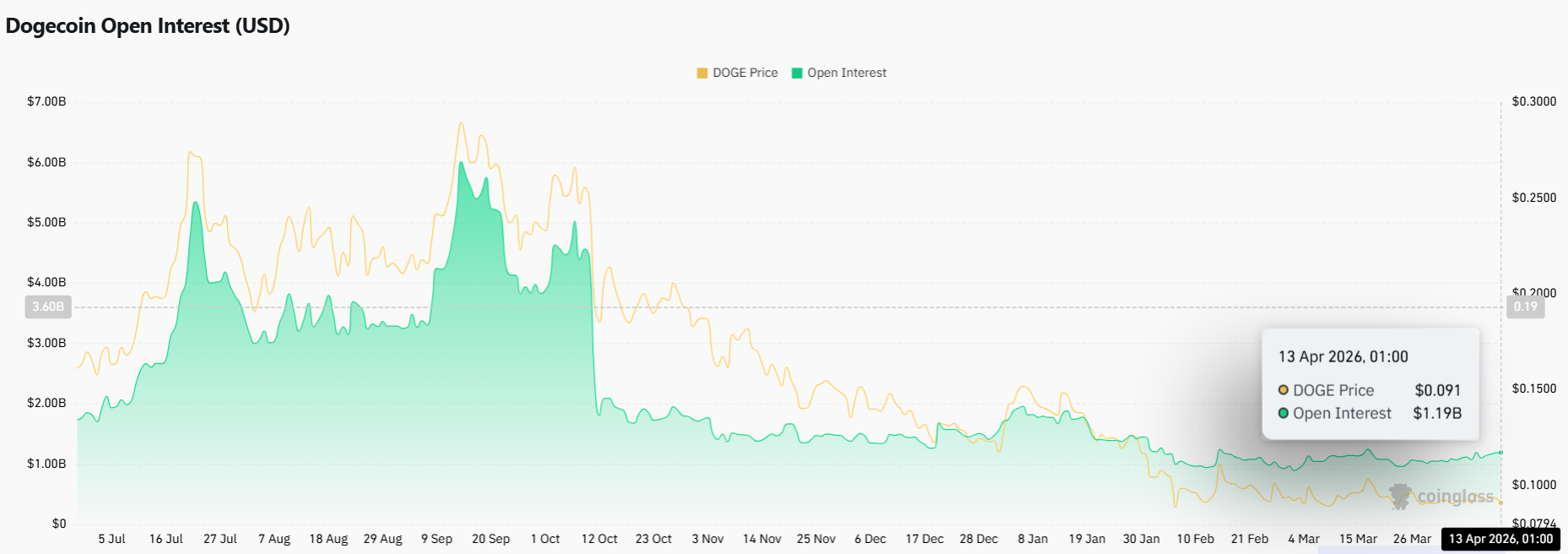 Dogecoin has largely moved sideways this month, with broader market pressure keeping it range-bound. Open interest in DOGE futures rose 1.61% in the last 24 hours, per Coinglass data.