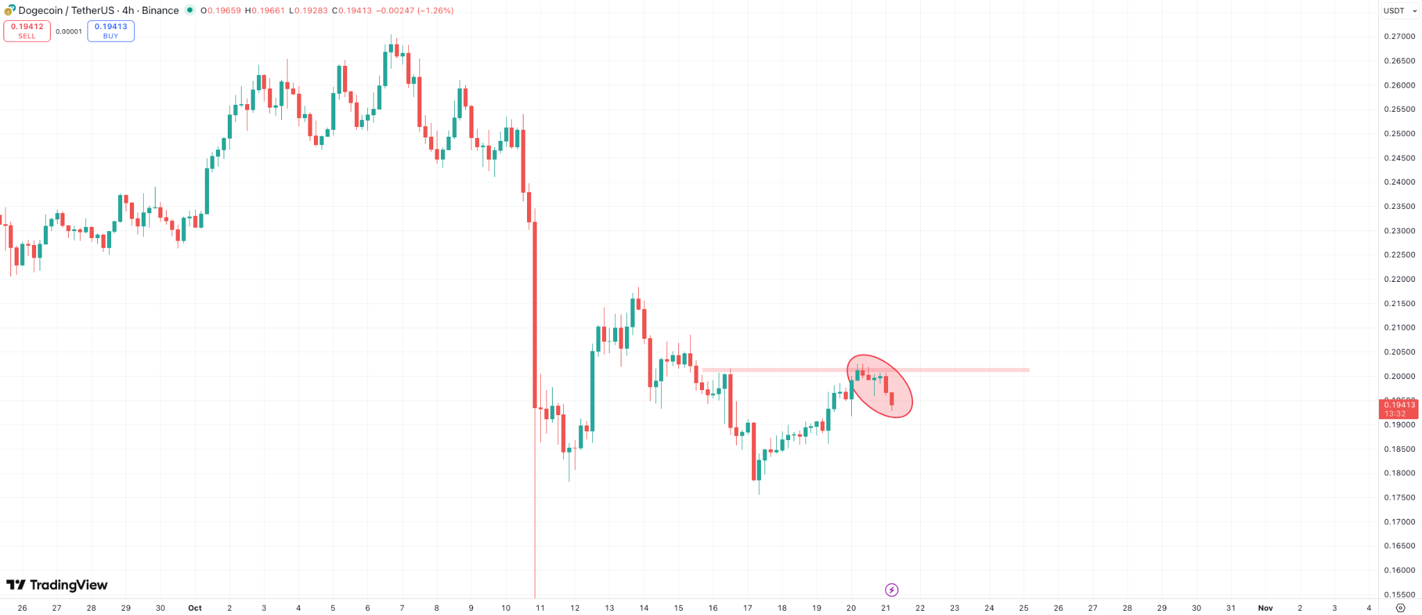 Technically speaking, things don’t look much better. You can see on the 4-hour chart where Dogecoin tried to break the $0.20 resistance level. It has tried twice this week and got rejected hard both times.