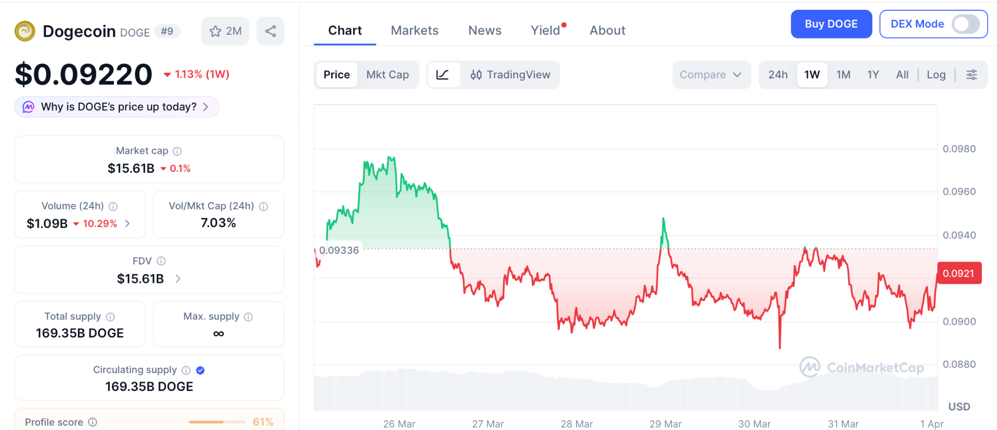 DOGE traded at $0.092 on March 31, according to CoinMarketCap. The token sits 87% below its all time high. Qubic launching DOGE mining mainnet April 1 adds new demand. DOGE consolidates above the 0.618 Fibonacci at $0.088, inside a descending channel since January.
