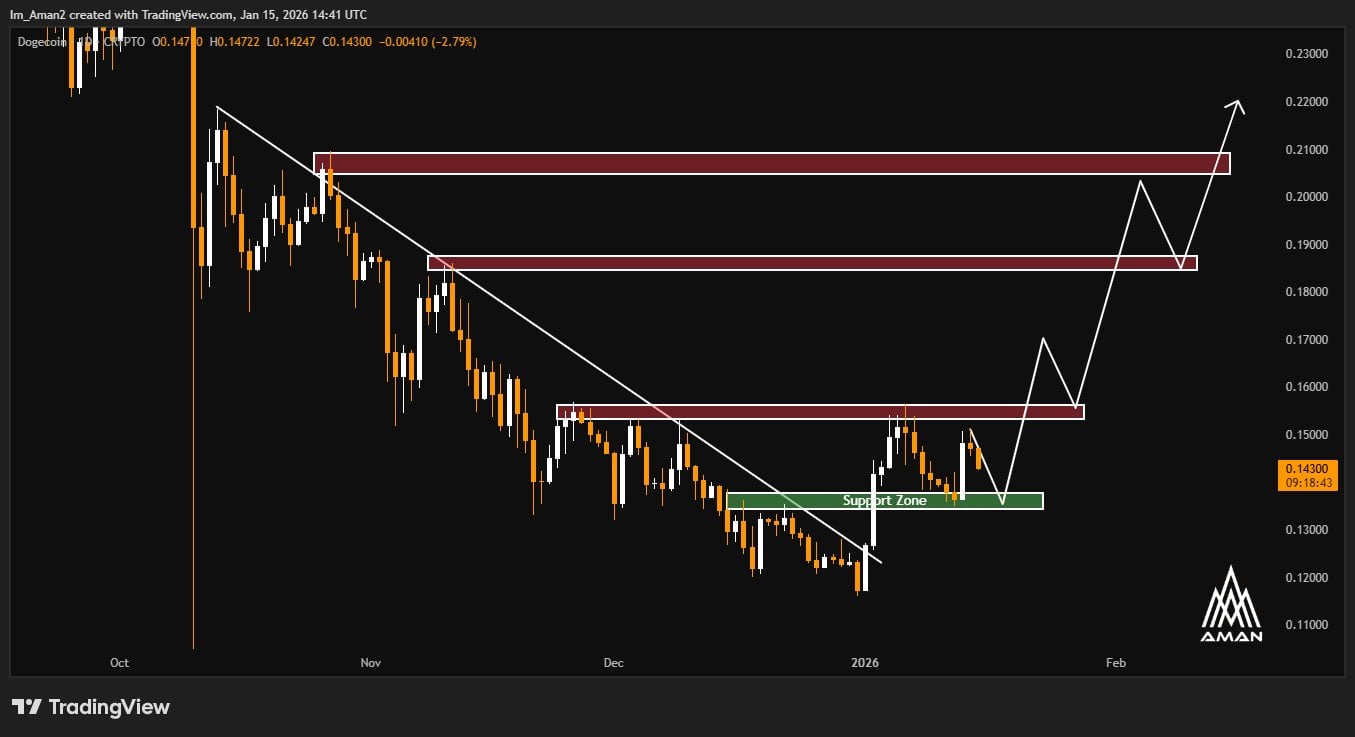 The Dogecoin token price has fallen by 1.6% on the weekly timeframe after the memecoin failed to surpass the resistance around $0.15. CoinGecko data shows the Dogecoin price was trading at $0.14 on January 16.